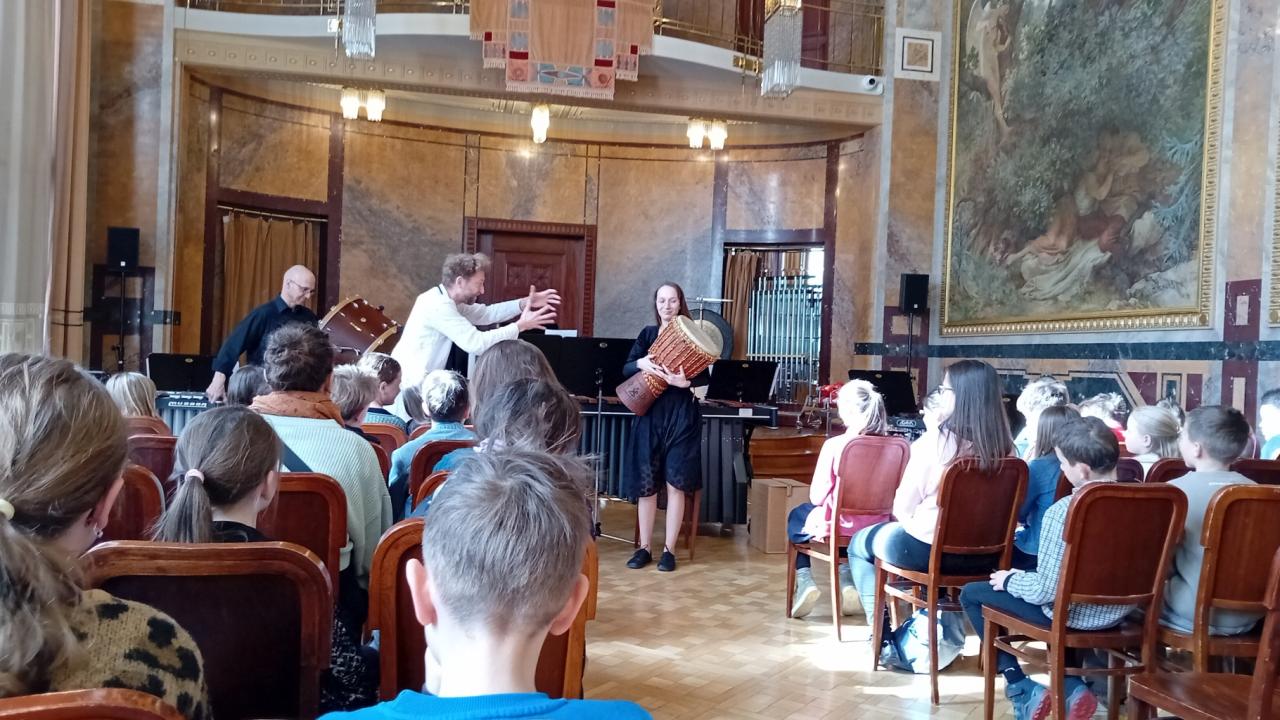 Hudební program byl zábavný od samého začátku. Rytmická sekce pražského FOK nám představila 25 nástrojů, které perkusisté symfonického orchestru využívají. Za zvuků skladby inspirované dálkovým vlakem Orient expres jsme procestovali 5 kontinentů a připomněli si jejich typické rytmy. Brazilskou sambu si společně zahráli odvážní dobrovolníci z publika a mezi nimi i Abi z naší třídy. Naše hudební cesta skončila v Japonsku.