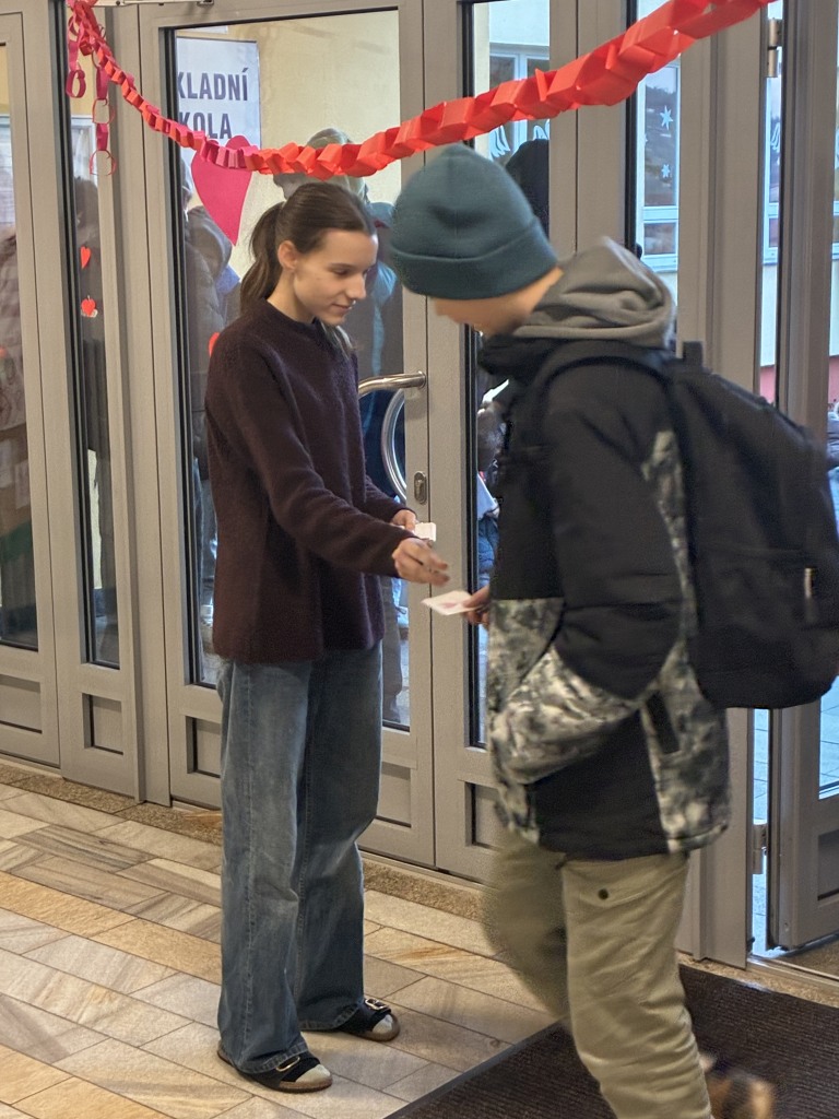 Dvě žákyně z třídy 8.A rozdávaly spolužákům valentýnky s povzbudivými vzkazy:
